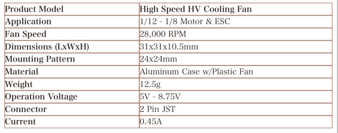 このファンは 2S HVコンポーネントで、デュアル ボール ベアリングと配線済みの 30mm長2 ピンJST コネクタを使用し耐久性のある構造になっています。