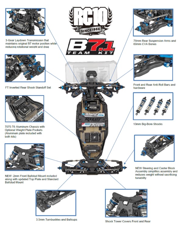 従来モデル同様、RC10B7.1とRC10B7.1Dはパーツの完全互換性を備えており、走行する路面コンディションに応じて、ユーザーが自由に構成を選択することが可能です。両モデルとも、Team Associatedレーシングプラットフォームが誇る高い耐久性、スピード性能、そしてチャンピオンの系譜を受け継いでいます。